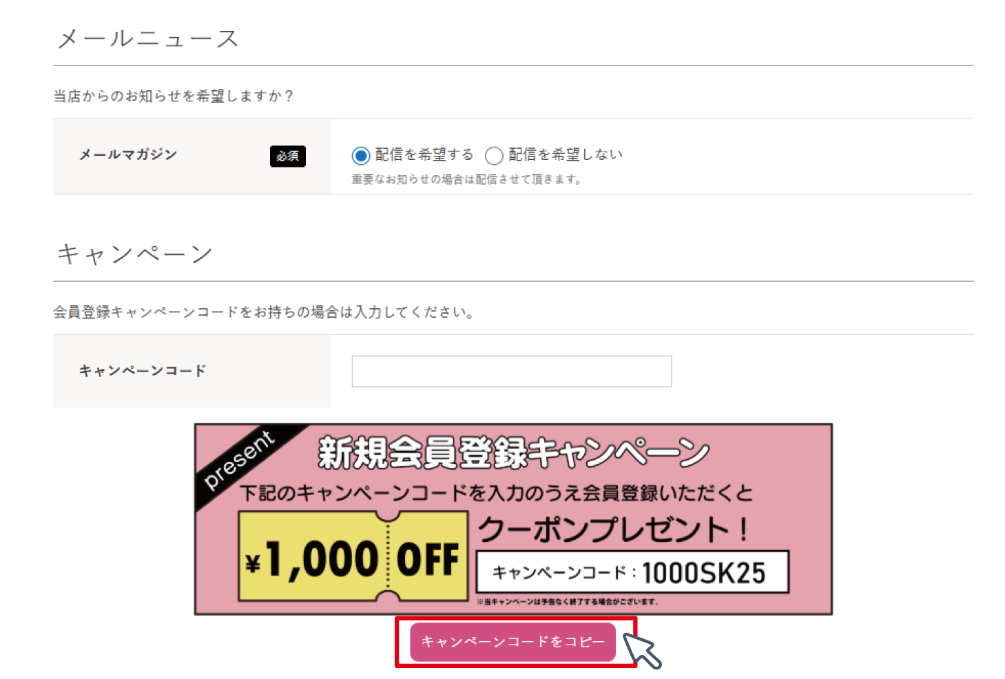 会員登録画面の必須項目を入力し「キャンペーン」項目の、