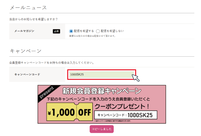 会員登録時に、キャンペーンコードを入力し会員登録をすると、