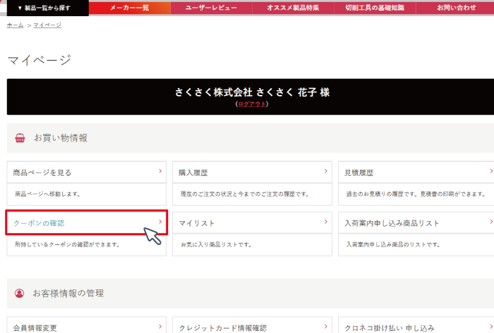 マイページから、「クーポンの確認」をクリック。