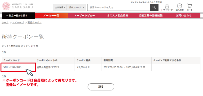 「所持クーポン一覧」画面から、「クーポンコード」の値をコピー。