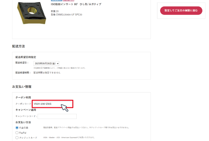 商品をご注文頂く際、「お支払い情報」の「クーポンコード」の欄にコピーしたクーポンコードを貼り付け。