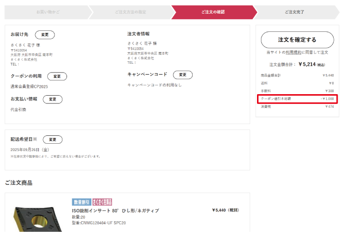 確認画面へ進み、クーポン値引きが適用されていることを確認して、注文を確定する。